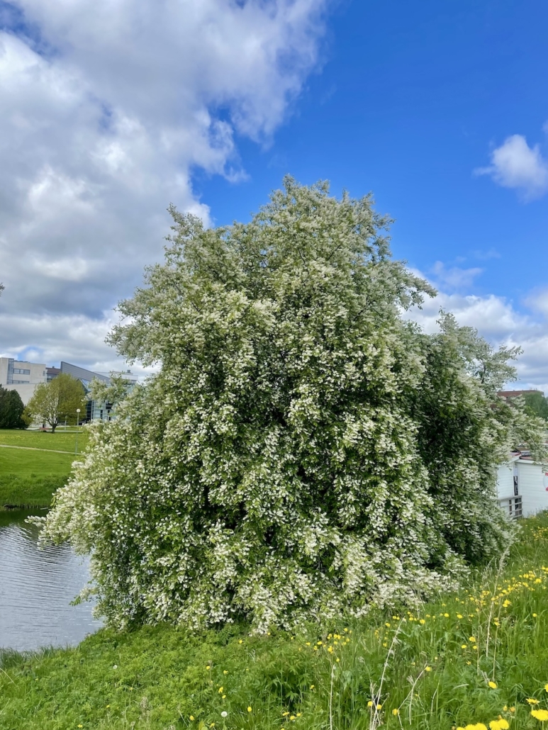 Kuljeskelin tänään pitkin jokirantaa, jonka reunamilla kukkivat ja tuoksuivat jättimäiset tuomet. Liitän tuomien kukinnan aina kevään valmistujaisaikaan, sillä omana lakkiaispäivänäni 39 vuotta sitten tädin mies kuvasi minut juuri kukkivan tuomen edustalla.