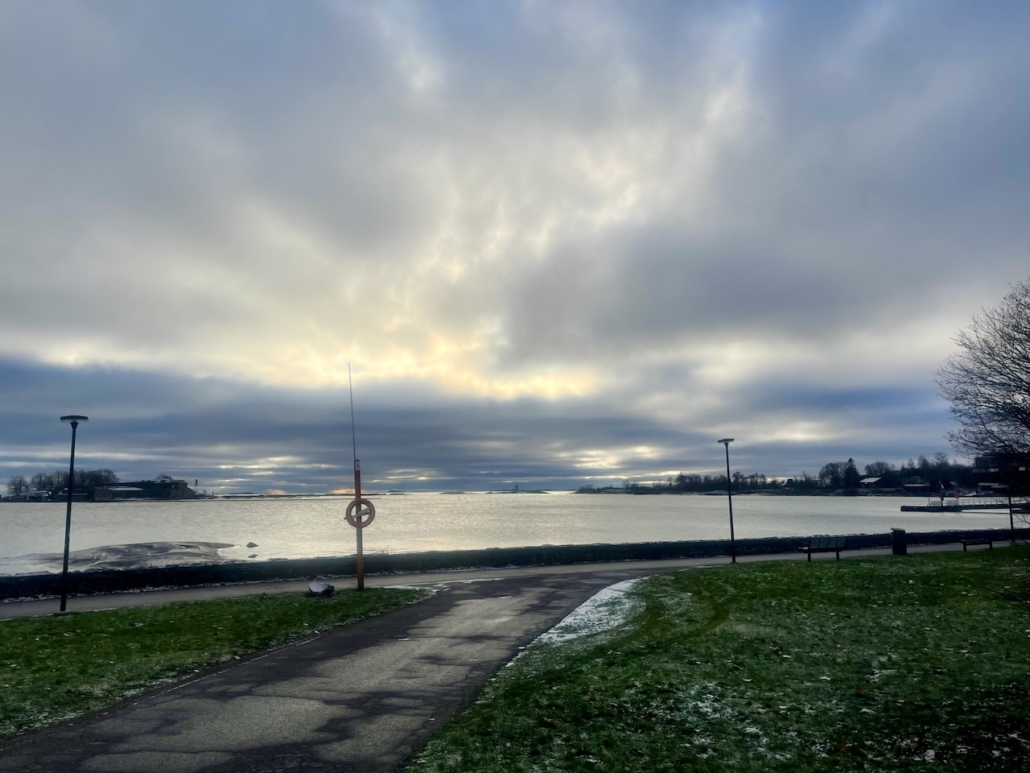 Kylmää kyytiä, lukee osuvasti erään firman kylmäkuljetusautojen kyljessä. Samanlaista oli kyyti tänään pyöräillessäni meriuinnin jälkeen päin pohjoisesta puhaltavaa vastatuulta. Eilen ennustamani ensilumikin oli heittänyt vähäsen hippusiaan nurmille ja pyöräreitille.
