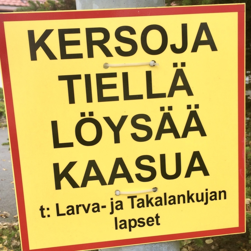 Liikennemerkki, jossa lukee "Kersoja tiellä, löysää kaasua".